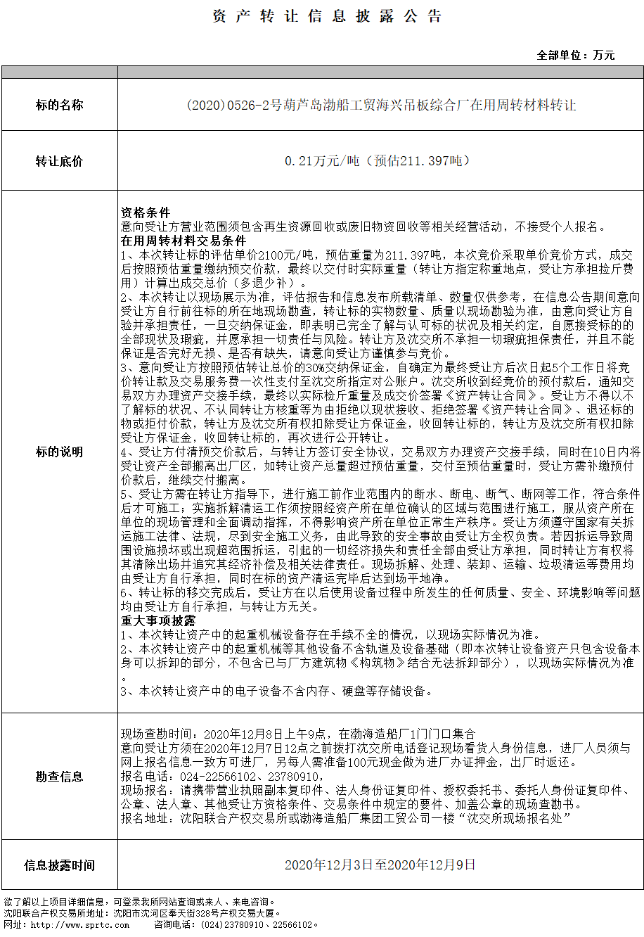(2020)0526-2號葫蘆島渤船工貿海興吊板綜合廠在用周轉材料轉讓