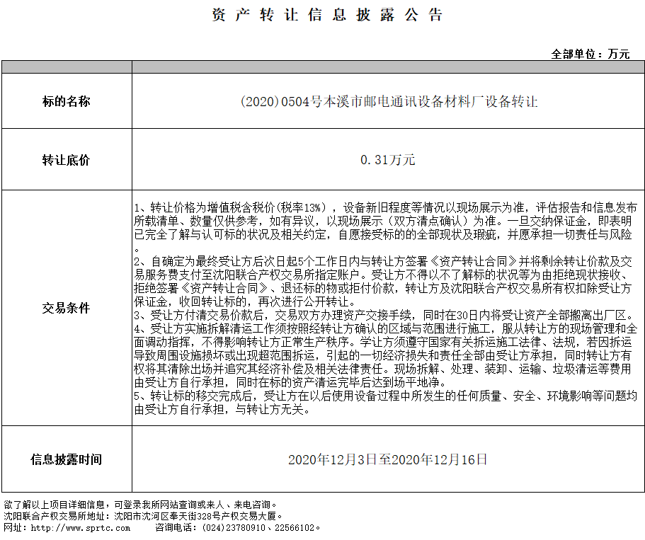 (2020)0504號本溪市郵電通訊設備材料廠設備轉(zhuǎn)讓