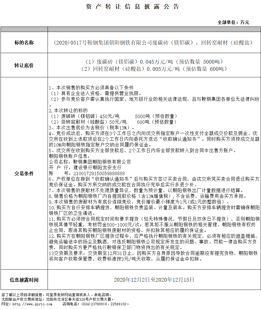 (2020)0517號鞍鋼集團朝陽鋼鐵有限公司廢碳磚(鎂鋁碳)、回轉(zhuǎn)窯耐材(硅酸鹽)