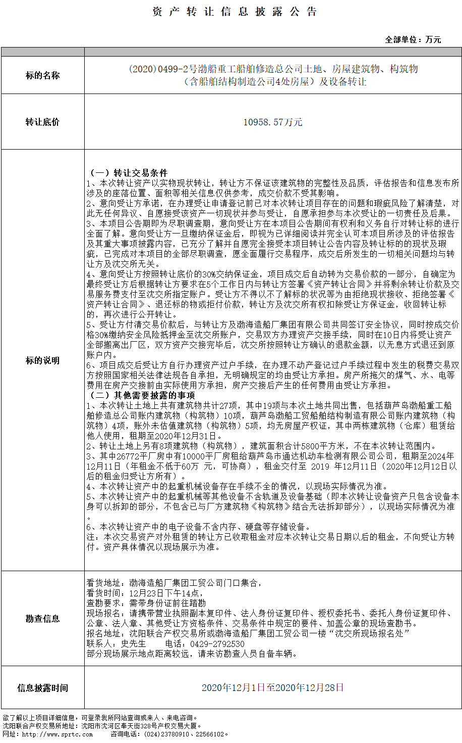 (2020)0499-2號渤船重工船舶修造總公司土地、房屋建筑物、構筑物(含船舶結(jié)構制造公司4處房屋)及設備轉(zhuǎn)讓