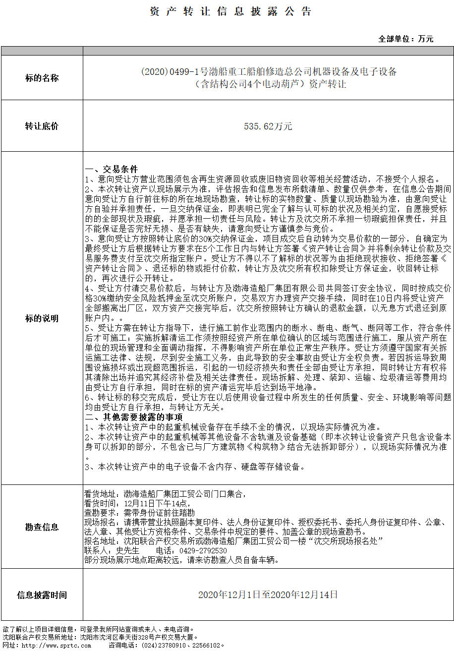 (2020)0499-1號渤船重工船舶修造總公司機器設備及電子設備(含結構公司4個電動葫蘆)資產(chǎn)轉讓