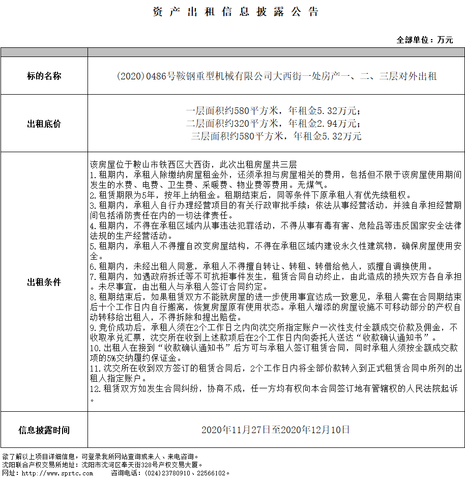 鞍鋼重型機(jī)械有限責(zé)任公司大西街一處房屋一層對(duì)外出租