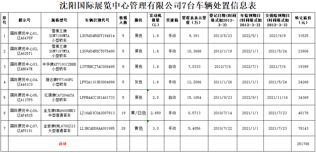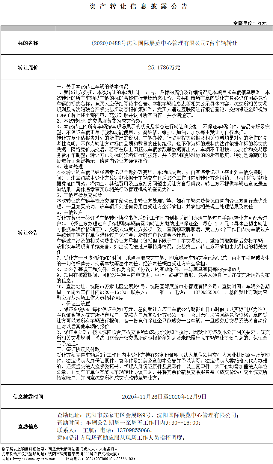 (2020)0488號沈陽國際展覽中心管理有限公司7臺車輛轉讓