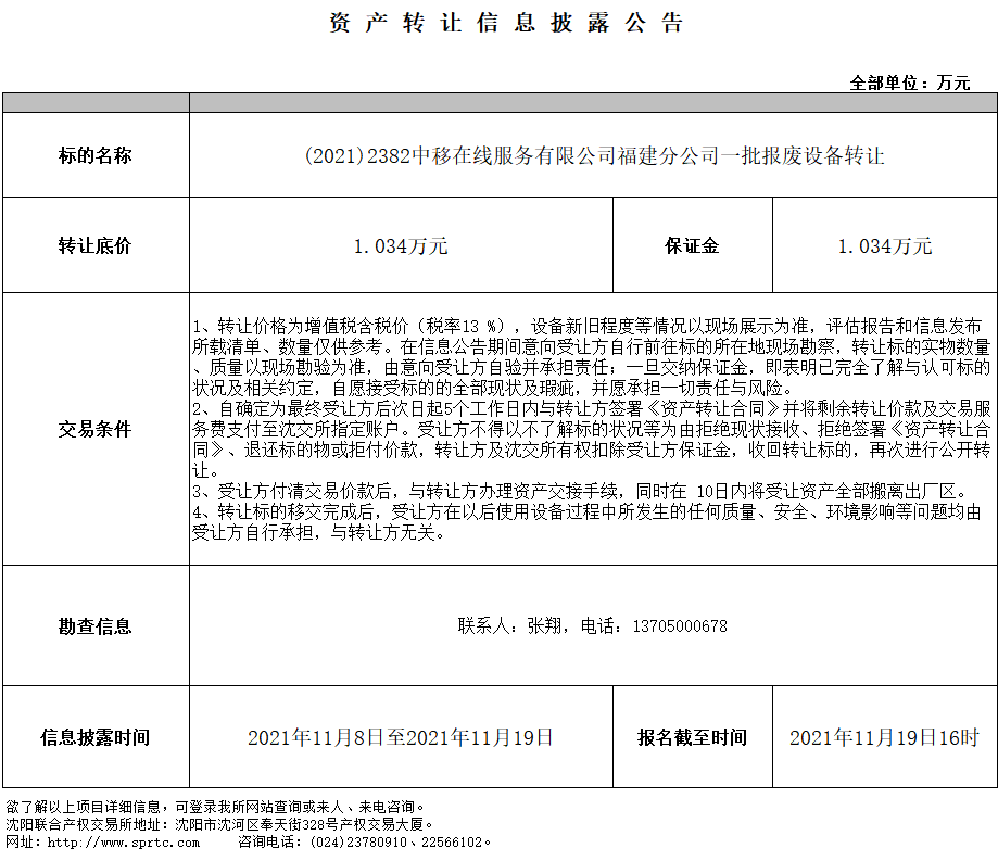 (2021)2382中移在線服務(wù)有限公司福建分公司一批報(bào)廢設(shè)備轉(zhuǎn)讓