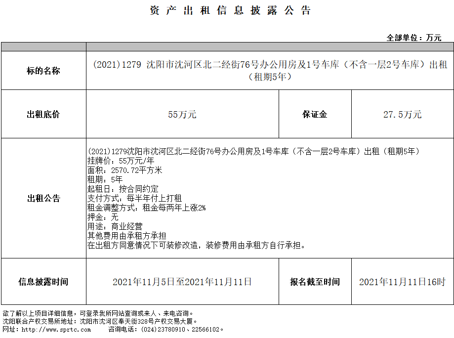 (2021)1279 沈陽市沈河區(qū)北二經(jīng)街76號辦公用房及1號車庫(不含一層2號車庫)出租(租期5年)