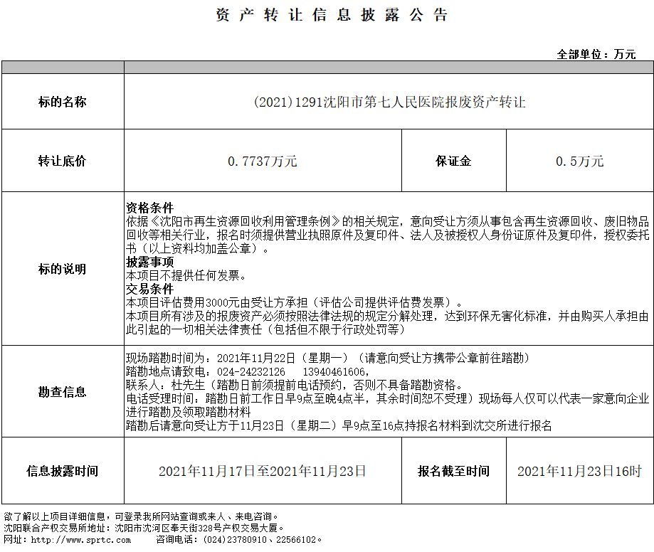 (2021) 1291沈陽市第七人民醫(yī)院報廢資產(chǎn)轉(zhuǎn)讓