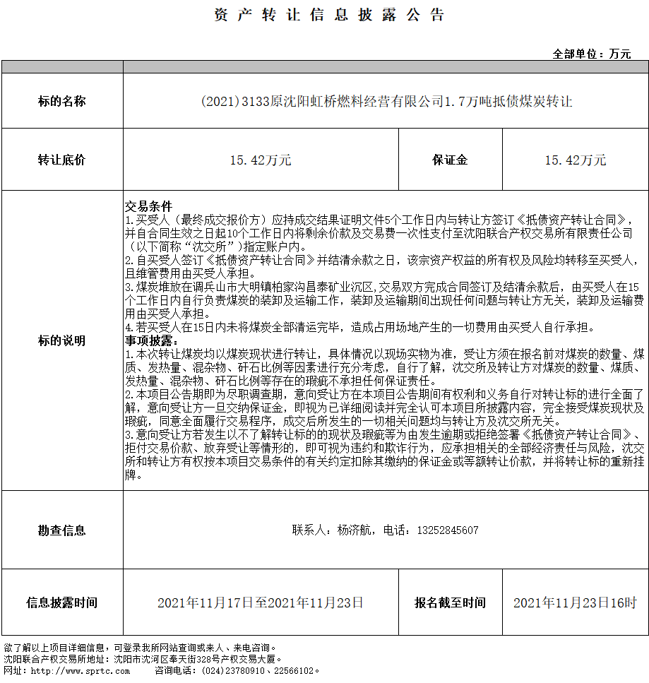 (2021)3133原沈陽虹橋燃料經(jīng)營(yíng)有限公司1.7萬噸抵債煤炭轉(zhuǎn)讓