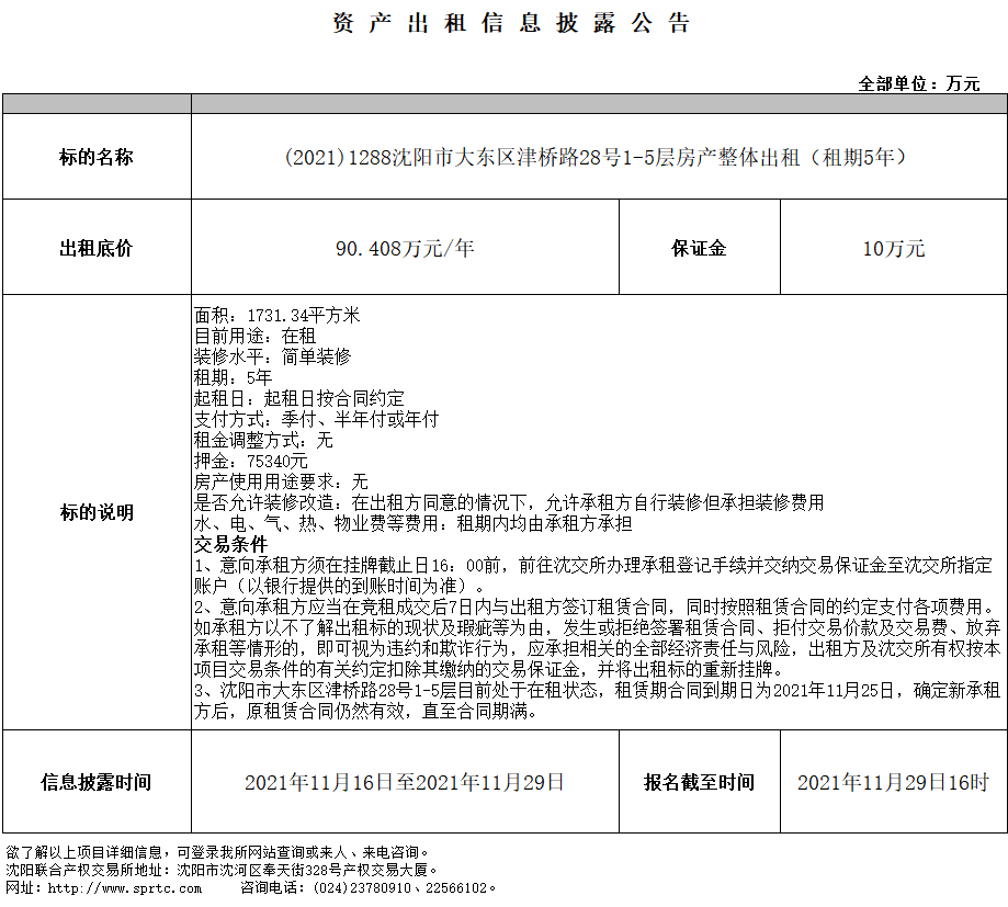 (2021)1288沈陽市大東區(qū)津橋路28號1-5層房產(chǎn)整體出租(租期5年)