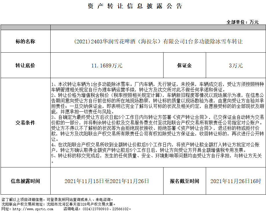 (2021)2403華潤雪花啤酒(海拉爾)有限公司1臺多功能除冰雪車轉(zhuǎn)讓