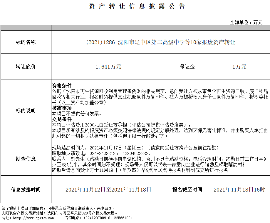 (2021)1286 沈陽市遼中區(qū)第二高級中學等10家報廢資產(chǎn)轉(zhuǎn)讓