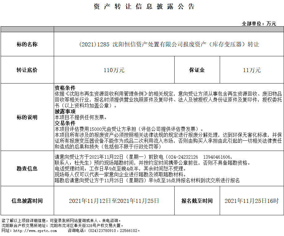 (2021)1285 沈陽(yáng)恒信資產(chǎn)處置有限公司報(bào)廢資產(chǎn)(庫(kù)存變壓器)轉(zhuǎn)讓