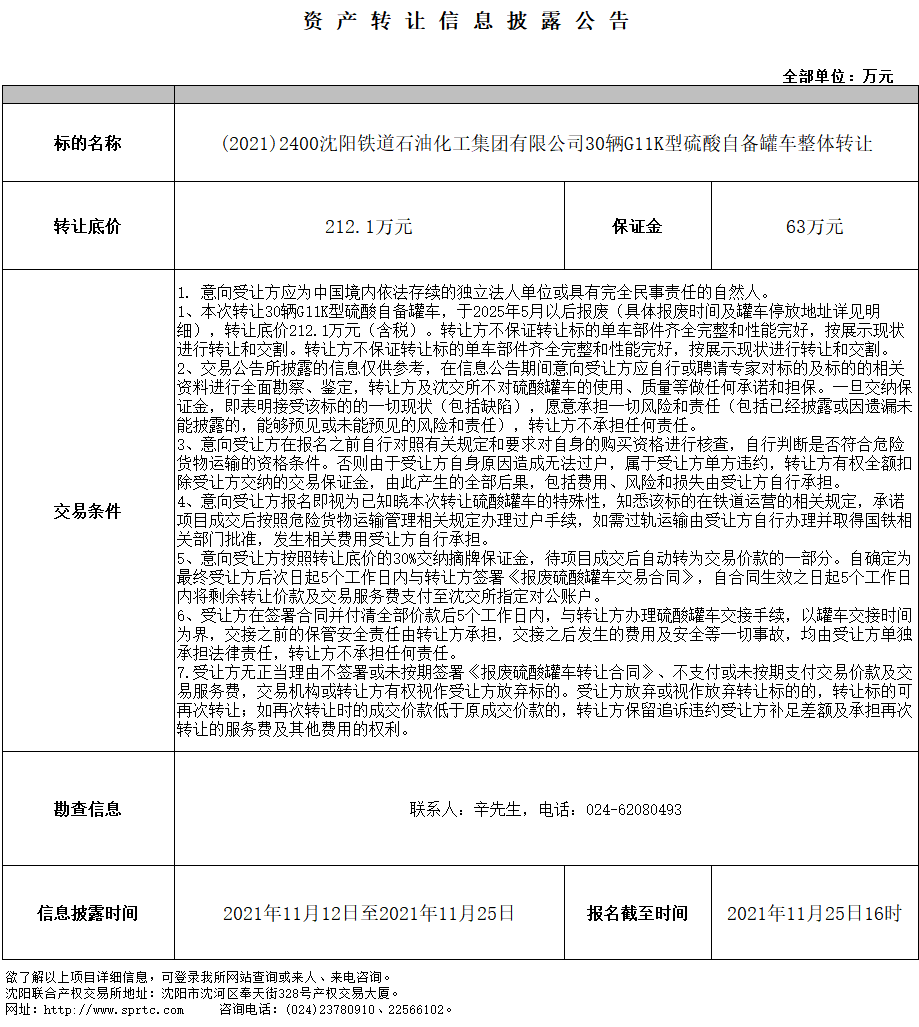 (2021)2400沈陽鐵道石油化工集團(tuán)有限公司30輛G11K型硫酸自備罐車整體轉(zhuǎn)讓
