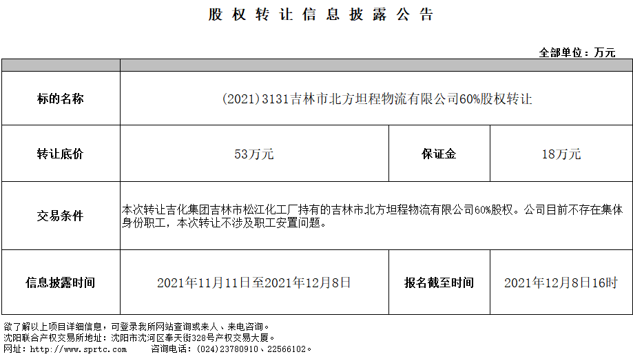(2021)3131吉林市北方坦程物流有限公司60%股權轉(zhuǎn)讓