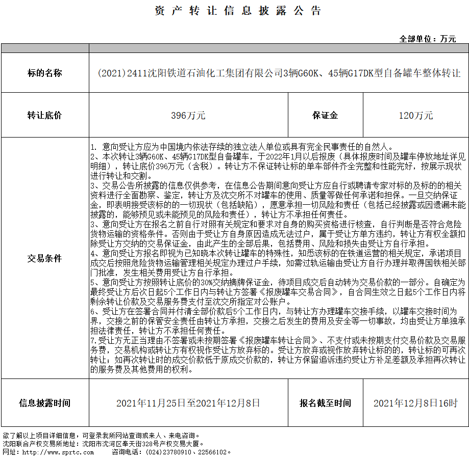 (2021)2411沈陽鐵道石油化工集團(tuán)有限公司3輛G60K、45輛G17DK型自備罐車整體轉(zhuǎn)讓