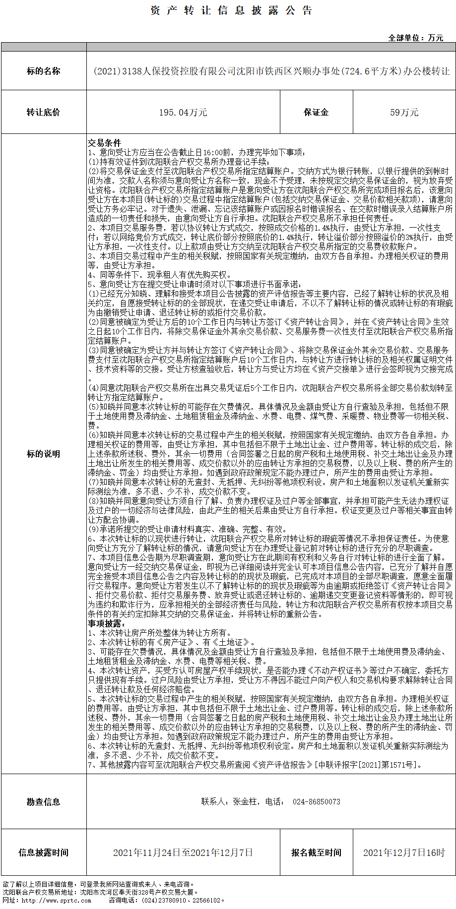 (2021)3138人保投資控股有限公司沈陽市鐵西區(qū)興順辦事處(724.6平方米)辦公樓轉(zhuǎn)讓