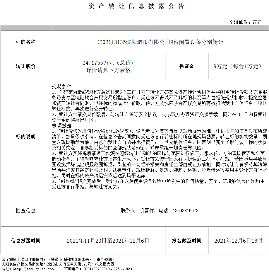 (2021)3135沈陽(yáng)造幣有限公司9臺(tái)閑置設(shè)備分別轉(zhuǎn)讓