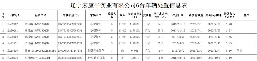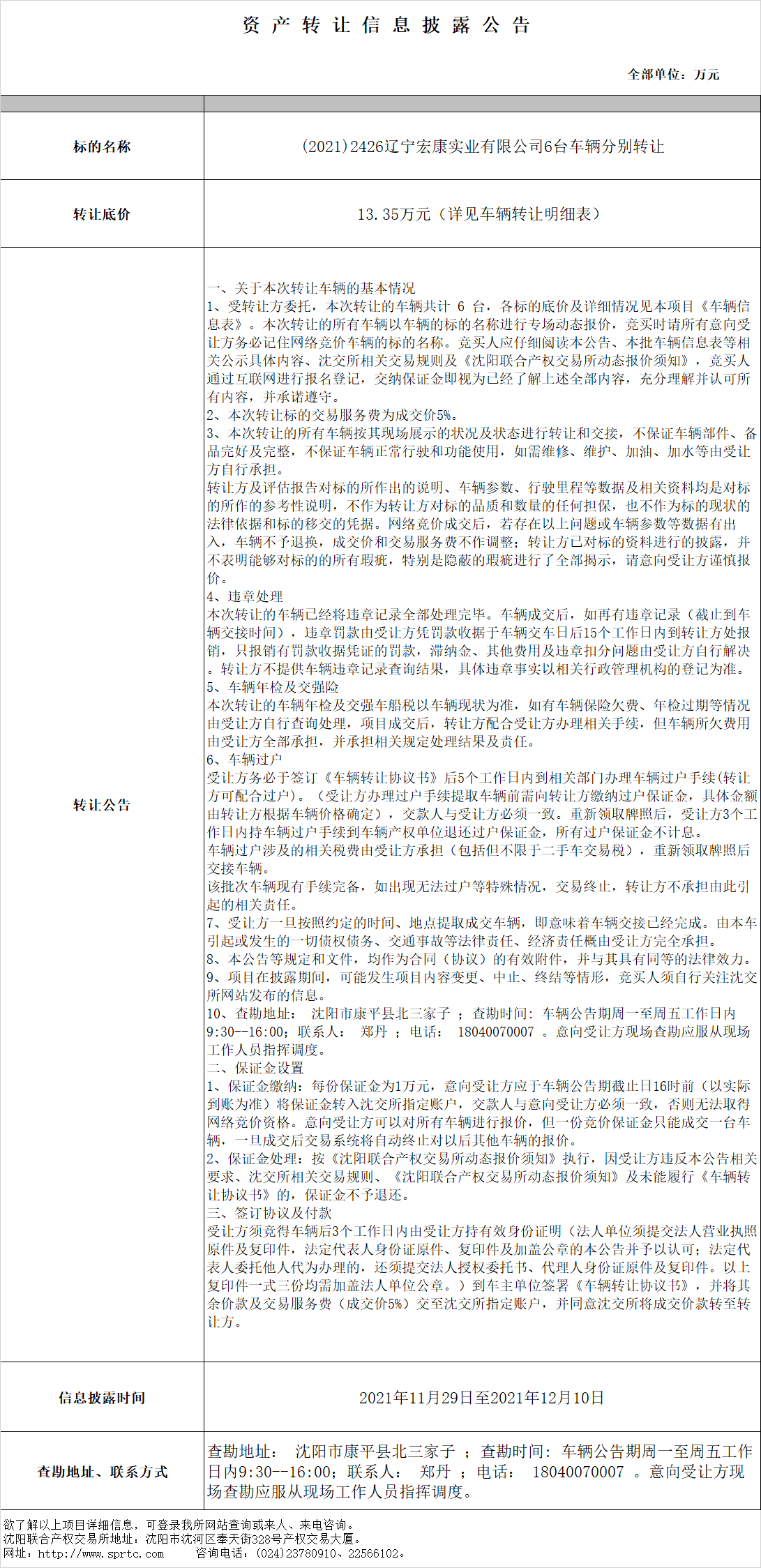 (2021)2426遼寧宏康實(shí)業(yè)有限公司6臺(tái)車輛分別轉(zhuǎn)讓
