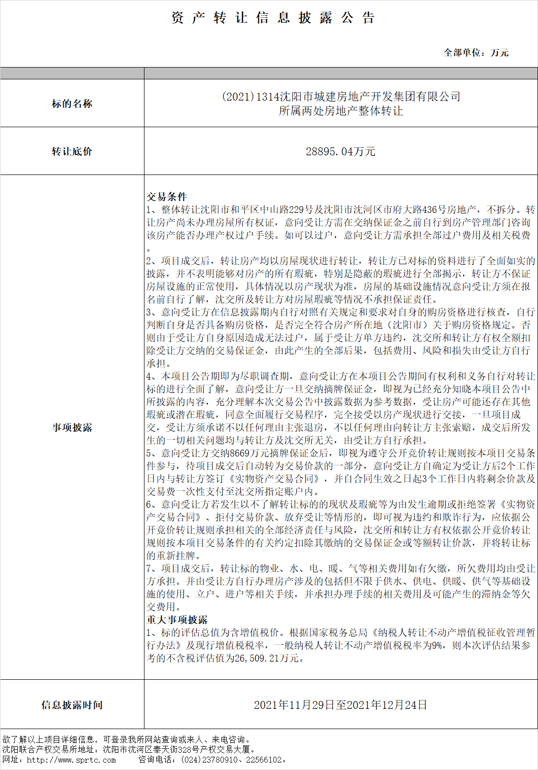 (2021)1314沈陽市城建房地產(chǎn)開發(fā)集團(tuán)有限公司所屬兩處房地產(chǎn)整體轉(zhuǎn)讓。