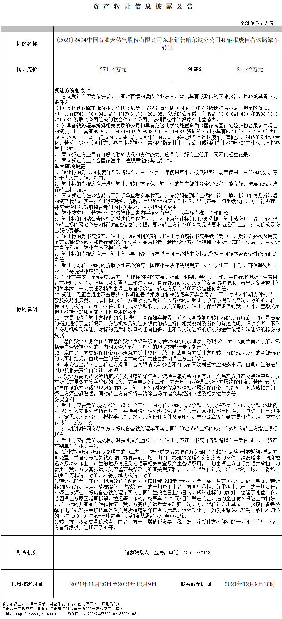 (2021)2424中國石油天然氣股份有限公司東北銷售哈爾濱分公司46輛報(bào)廢自備鐵路罐車轉(zhuǎn)讓