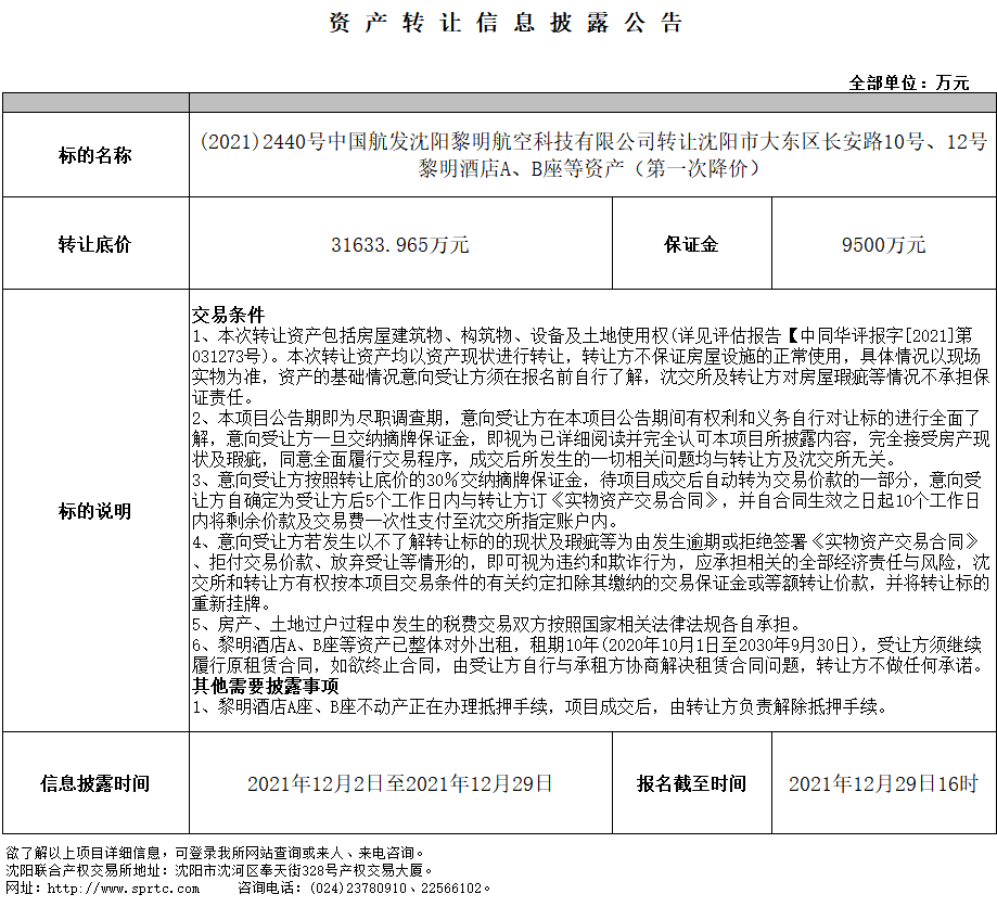(2021)2440沈陽(yáng)市大東區(qū)長(zhǎng)安路10號(hào)、12號(hào)黎明酒店A、B座等資產(chǎn)轉(zhuǎn)讓(第一次降價(jià))