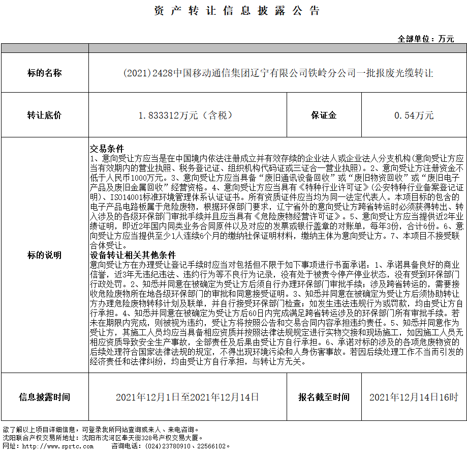 (2021)2428中國(guó)移動(dòng)通信集團(tuán)遼寧有限公司鐵嶺分公司一批報(bào)廢光纜轉(zhuǎn)讓