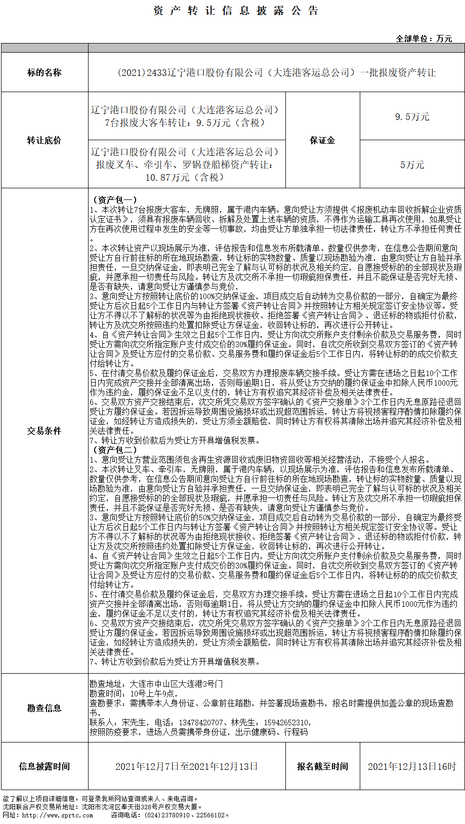 (2021)2433-1遼寧港口股份有限公司(大連港客運(yùn)總公司)7臺(tái)報(bào)廢大客車(chē)轉(zhuǎn)讓