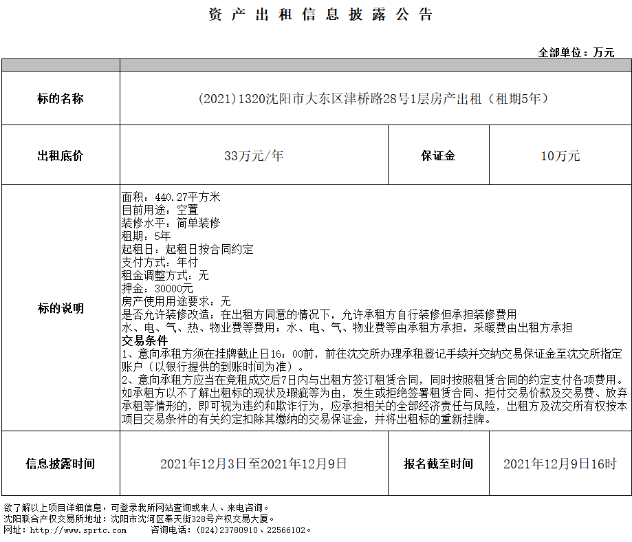 (2021)1320沈陽市大東區(qū)津橋路28號1層房產(chǎn)出租(租期5年)