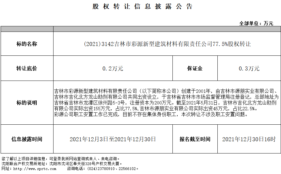 (2021)3142吉林市彩源新型建筑材料有限責(zé)任公司77.5%股權(quán)轉(zhuǎn)讓