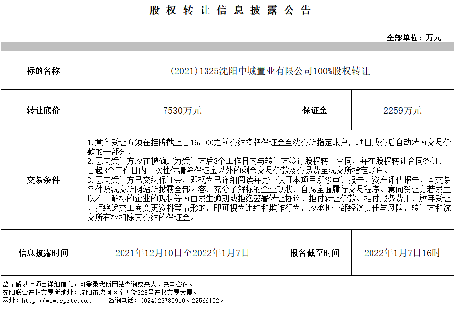 (2021)1325沈陽中城置業(yè)有限公司100%股權(quán)轉(zhuǎn)讓