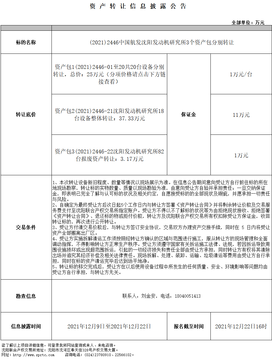 (2021)2446中國(guó)航發(fā)沈陽(yáng)發(fā)動(dòng)機(jī)研究所3個(gè)資產(chǎn)包分別轉(zhuǎn)讓