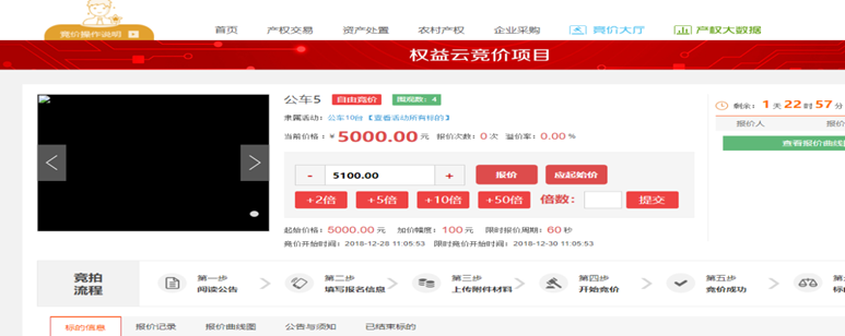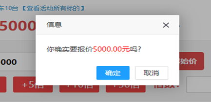 點(diǎn)擊應(yīng)起始價(jià),系統(tǒng)彈出提示信息(如上圖),核對(duì)后點(diǎn)擊確定,報(bào)價(jià)成功。如果已經(jīng)有人報(bào)價(jià),點(diǎn)擊報(bào)價(jià)即可。