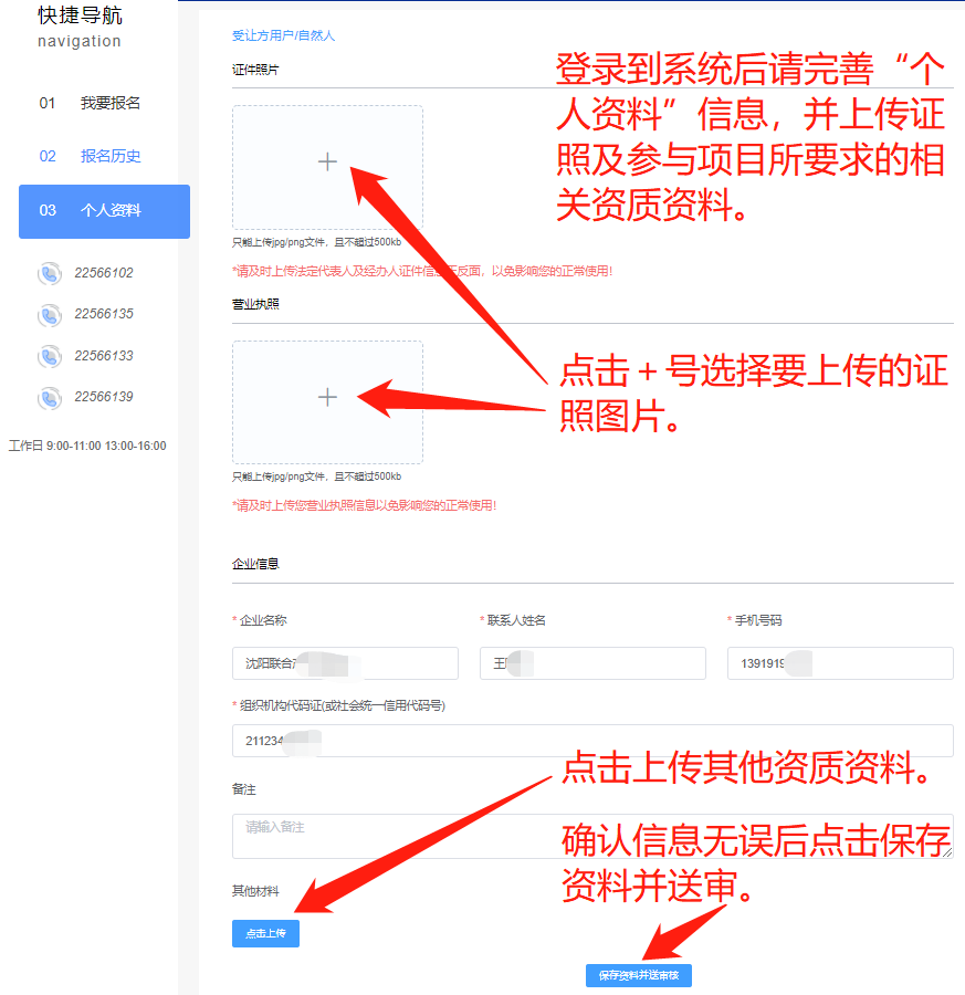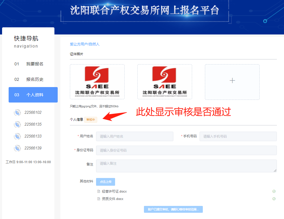5、個人受讓方需上傳身份證正反面及其他項目要求的相關資質(zhì),企業(yè)受讓方還需上傳企業(yè)營業(yè)執(zhí)照。所有信息填寫、上傳完成后點擊“保存資料并送審核“等待鑒證審核。