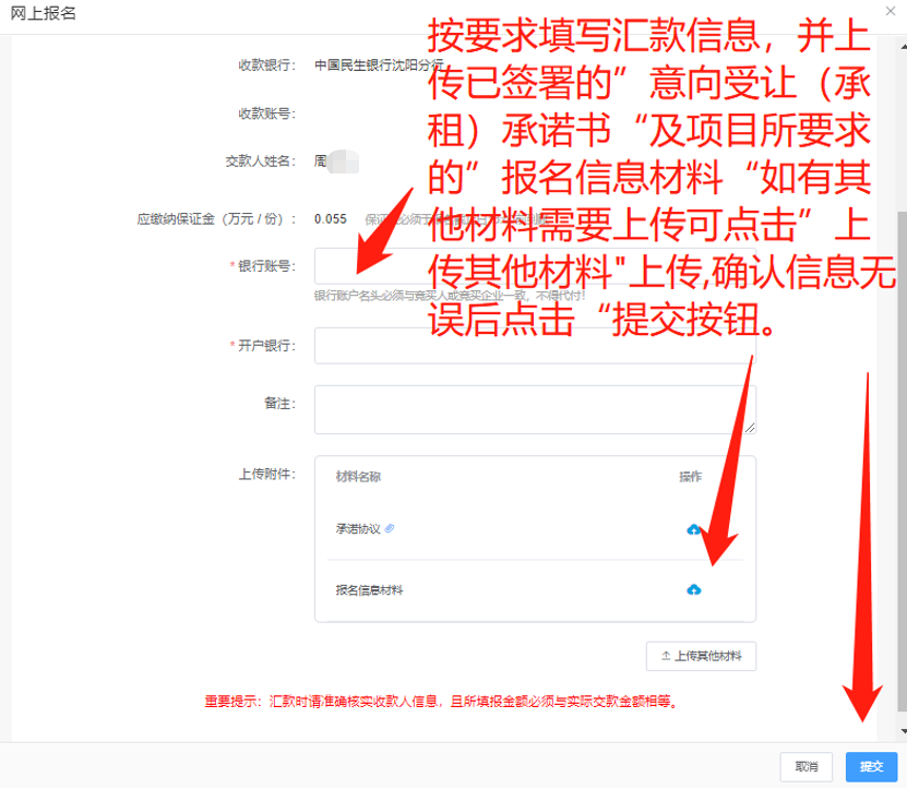 9、在隨后彈出的“網(wǎng)上報名”信息欄中按要求查看和填寫交款信息,并上傳已簽署的“意向受讓(承租)承諾書”及項目所要求的“報名信息材料”其他需要上傳的材料可點擊“上傳其他材料”上傳,確認信息無誤后點擊“提交按鈕。