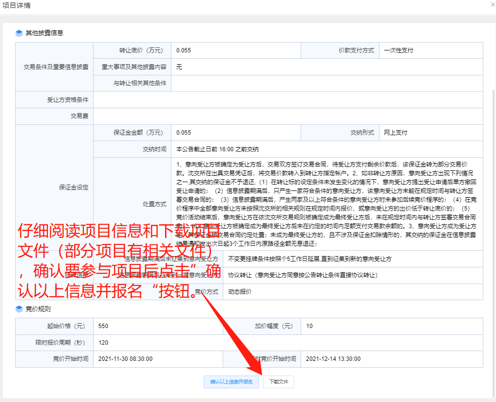 8、點擊報名按鈕后會彈出此項目的詳細信息,請仔細閱讀充分了解后確定是否要參與此項目,確定參與此項目則點擊下方“確認以上信息并報名“按鈕,隨后會彈出再次確認提示,確認后彈出意向受讓/承租承諾書,仔細閱讀并同意后方可參與項目。