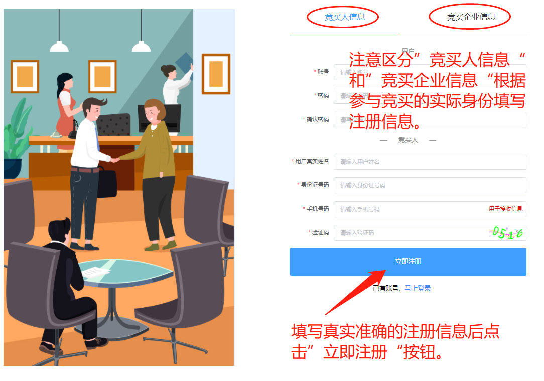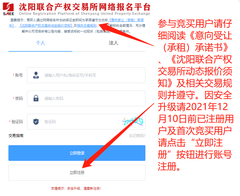 2、因安全升級, 2021年12月10日前已注冊用戶需要重新進行賬號注冊,請以上用戶和首次競買用戶點擊“立即注冊“按鈕進行賬號注冊,2021年12月13日后已注冊賬號用戶可直接登錄系統(tǒng)。