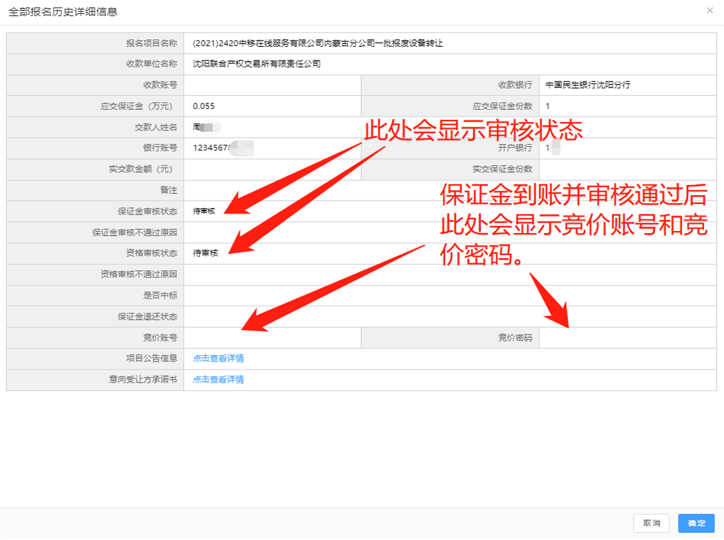 11、當“平臺”確認您的交款到賬并審核通過后,報名歷史詳情頁面中會顯示您參與此項目的競價賬號和競價密碼。