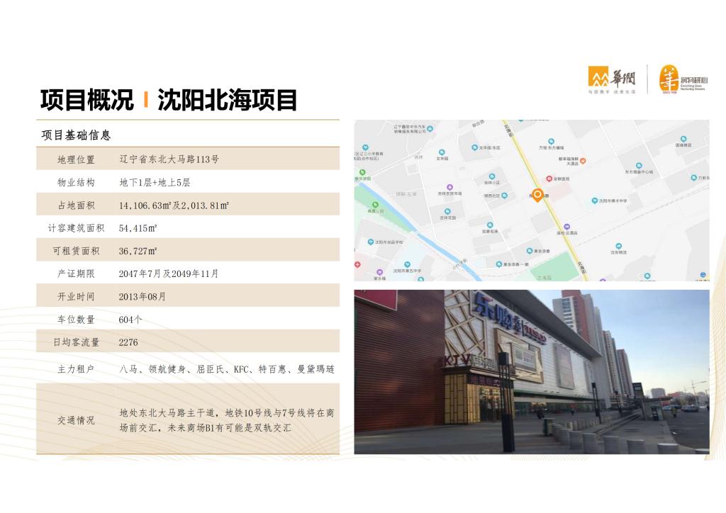 房產(chǎn)名稱:沈陽北海樂都匯地理位置:遼寧省東北大馬路113號物業(yè)結(jié)構(gòu):地下1層+地上5層占地面積:14,106.63㎡及2,013.81㎡計容建筑面積:54,415㎡可租賃面積:36,727㎡車...